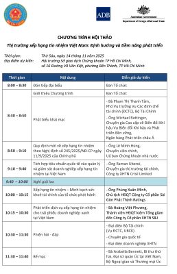 Hội thảo “Thị trường Xếp hạng tín nhiệm Việt Nam: Định hướng và tiềm năng phát triển” (diễn ra ngày 14/11/2025 tại Sở Giao dịch Chứng khoán TP.HCM). Số 16 Đường Võ Văn Kiệt, Phường Bến Thành, TP Hồ Chí Minh. Tập trung phân tích khung pháp lý mới, tiêu chuẩn quốc tế, cũng như ứng dụng Xếp hạng tín nhiệm trong phát triển thị trường vốn, đặc biệt cho Trái phiếu doanh nghiệp xanh. Chương trình chính thức và danh sách diễn giả được lấy từ chương trình hội thảo do Ban Tổ chức cung cấp.