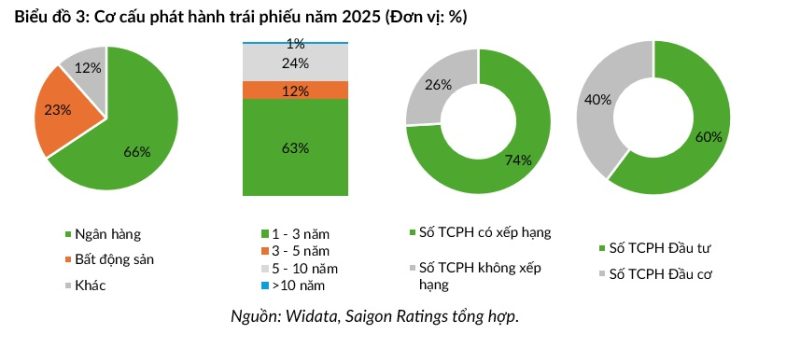 Về cơ cấu ngành, nhóm ngân hàng tiếp tục giữ vai trò chủ đạo, chiếm khoảng 66% tổng giá trị phát hành, phản ánh nhu cầu huy động vốn trung và dài hạn để đáp ứng tăng trưởng tín dụng và các yêu cầu an toàn vốn. Nhóm bất động sản đứng thứ hai với tỷ trọng khoảng 23%, chủ yếu phục vụ nhu cầu tái cấu trúc nợ và triển khai dự án trong bối cảnh tín dụng ngân hàng vẫn được kiểm soát chặt.